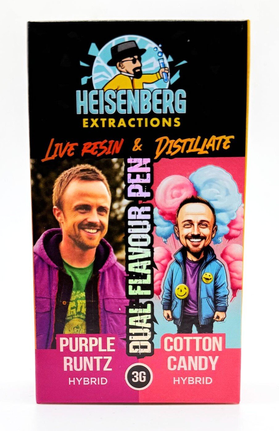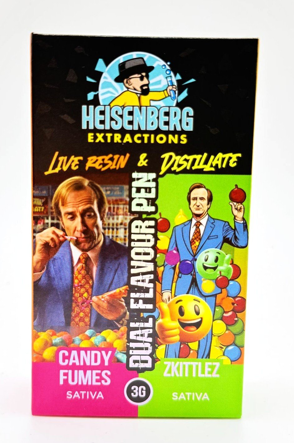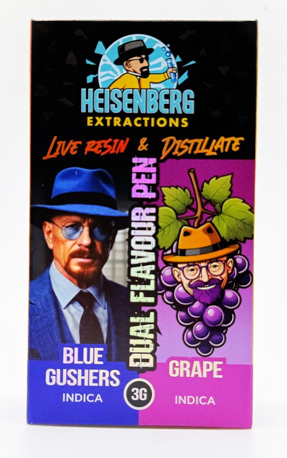Heisenberg Extractions disposable Vape Pen contain 3 grams of THC and with there revolutionary duel chamber technology you can enjoy 2 flavours in 1 device! THC 90+%